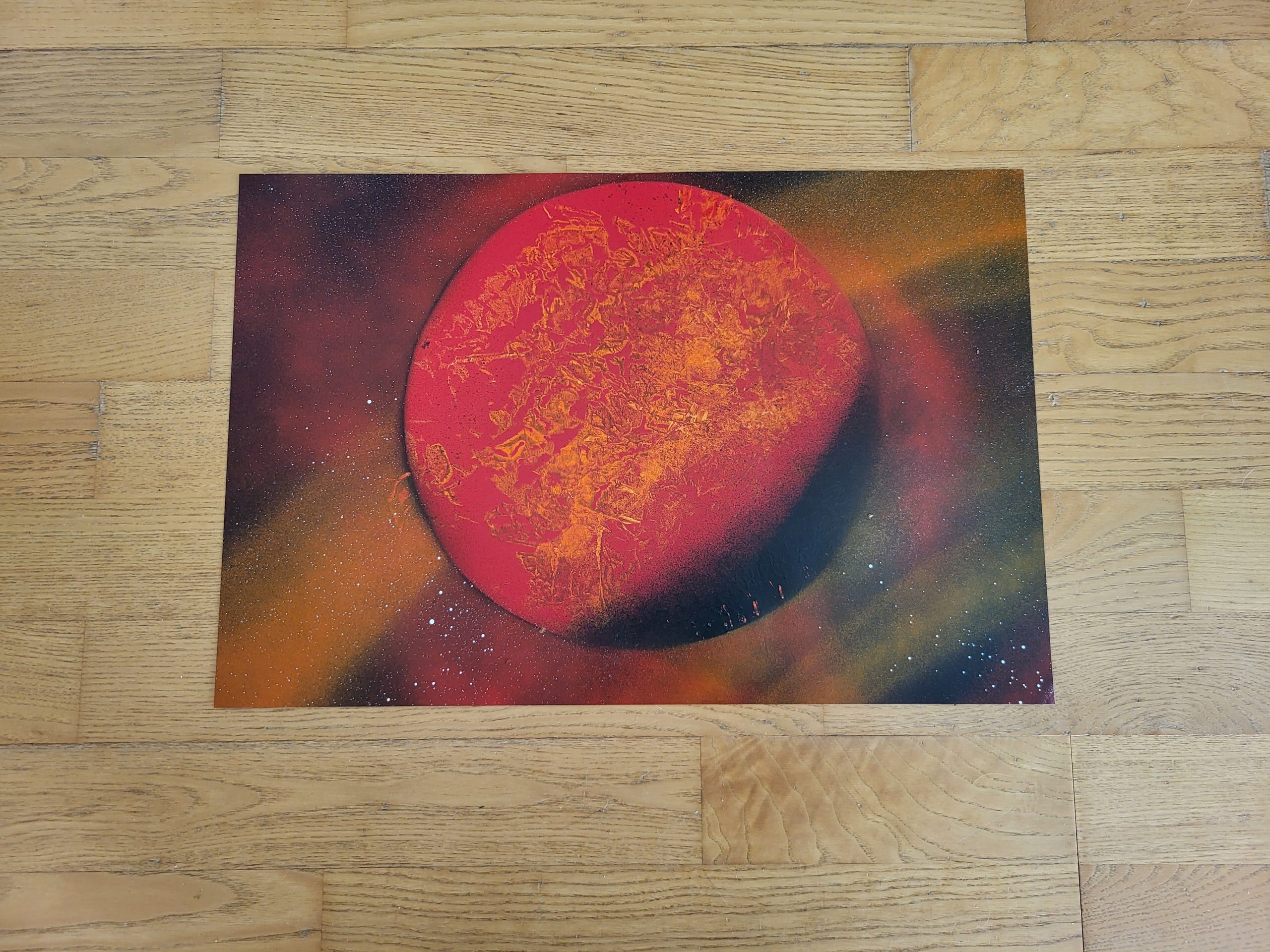 A unique spray-painted version of the planet mars, in a redish space setting. Created entirely by hand – not a print, just one single original.